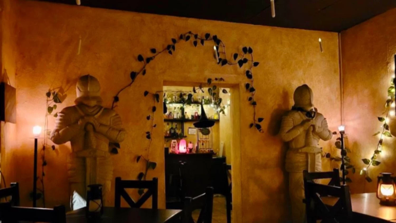 La decoración es una declaración de intenciones. El salón principal luce muros dorados y armaduras; por la noche, luces que simulan auroras pintan el techo y transforman el ambiente en un pequeño “castillo” de bolsillo. Cada vela, cada vitrina, cada gadget de laboratorio fue colocado para sostener la ilusión de un taller de magos donde el detalle importa. Es el tipo de lugar que hace que mires hacia arriba antes de sentarte.