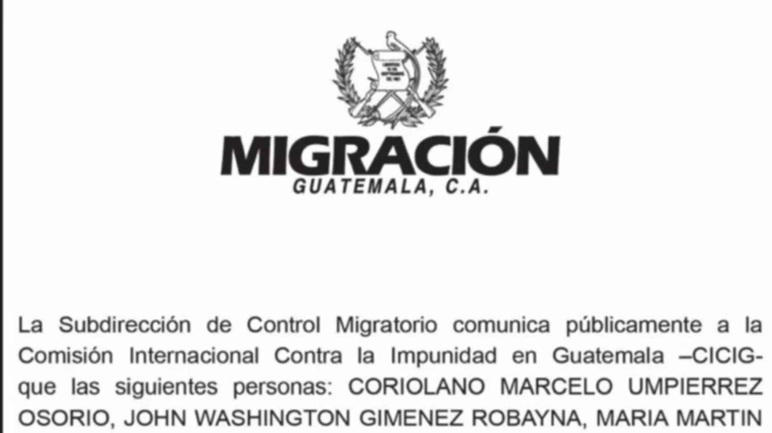 El personal de CICIG con orden de expulsión, son: Coriolano Marcelo, Umipierrez Osorio, John Washington Jiménez Robayna, María Martín Quintana, Fernando Robles Reyes, Yilen Osorio Zuluaga.
