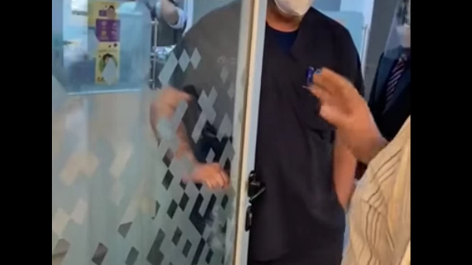 El médico conversa en la puerta y unos minutos después de solicitar a una mujer que no siga grabando, molesto, tira la puerta al paciente.