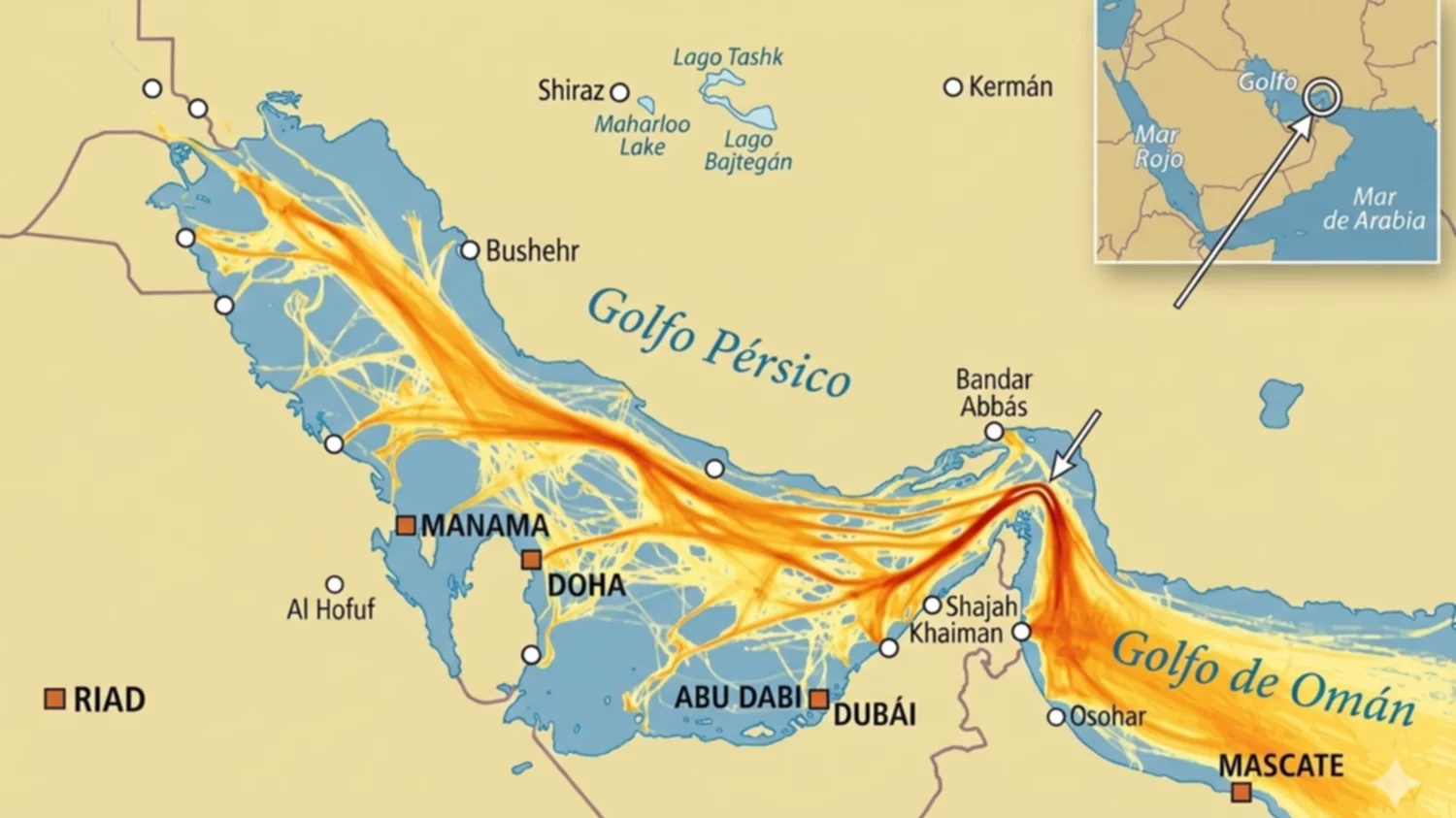 Principales rutas de transporte marítimo en el Golfo Pérsico, con un tráfico concentrado en el Estrecho de Ormuz, un punto de congestión clave que une la región con el Golfo de Omán.