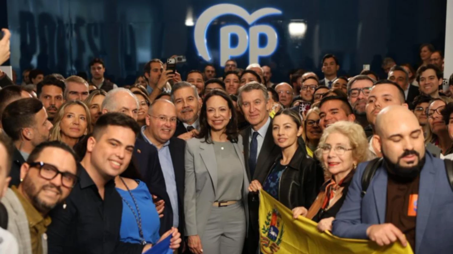 - El partido desplegó la misma escenografía utilizada tras victorias electorales, con cargos territoriales, juventudes populares y representantes del exilio venezolano concentrados a las puertas de la sede.