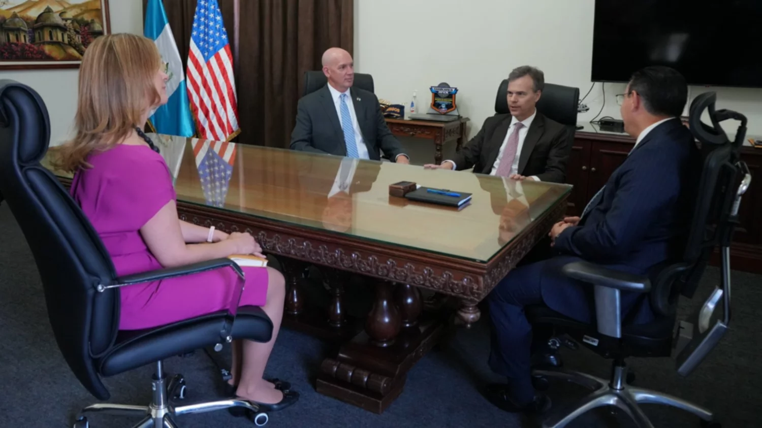 - En la reunión participaron también John M. Barrett, encargado de negocios saliente de la Embajada de EE. UU. en Guatemala, y Kelly Hapka, funcionaria de la Oficina de Asuntos Internacionales de Narcóticos y Aplicación de la Ley (INL) del Departamento de Estado.